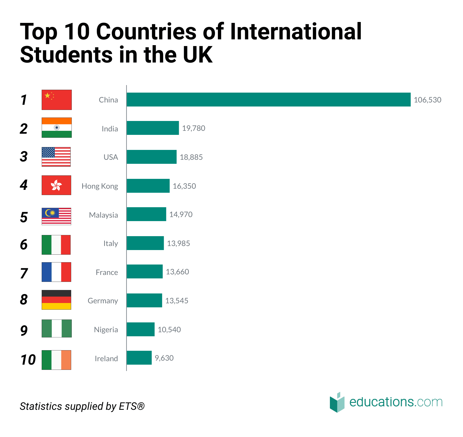 Most international students in the UK are from China, but there are also many students from India, the USA, Hong Kong, Malaysia, Italy, France, Germany, Nigeria, and Ireland. Therefore, the vast majority of international students coming to the United Kingdom do not speak English as a first language and must take an English proficiency test like the TOEFL iBT test.